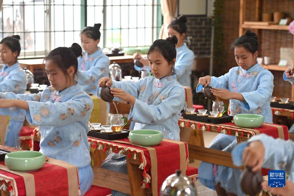 3月29日,在廣西梧州市蒼梧縣六堡鎮中心校,小學(xué)生們在學(xué)習茶藝。