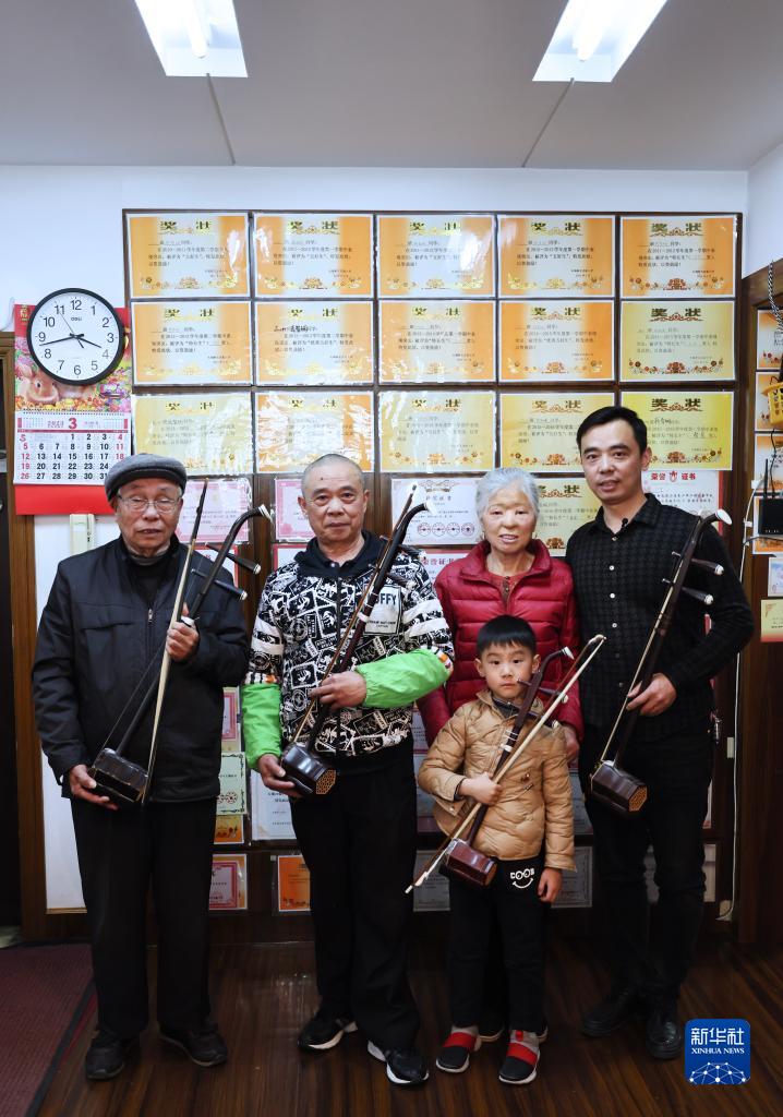 識譜、拉弦樣樣不懂,錢(qián)?;奶幱懡?,然后回家摸索練習,慢慢掌握二胡演奏技巧。受他的影響,兒子錢(qián)建平也愛(ài)上了二胡演奏。生活條件越來(lái)越好,孫子錢(qián)鈞在女兒錢(qián)智嫻5歲時(shí)便開(kāi)始請專(zhuān)業(yè)二胡老師授課,父女倆一起學(xué)習,共同提高。2019年,錢(qián)智嫻獲得第四屆“敦煌杯”中國二胡演奏比賽非職業(yè)少年B組金獎。如今,錢(qián)鈞7歲的兒子錢(qián)智臣以姐姐為榜樣,也開(kāi)始練習二胡。