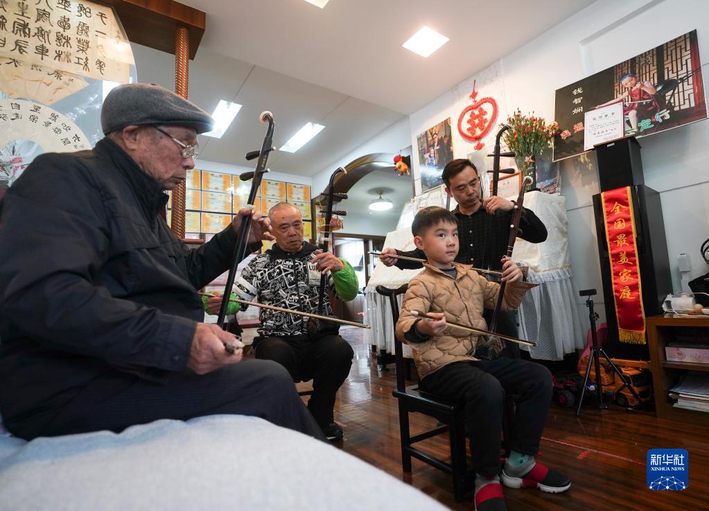 識譜、拉弦樣樣不懂,錢(qián)?;奶幱懡?,然后回家摸索練習,慢慢掌握二胡演奏技巧。受他的影響,兒子錢(qián)建平也愛(ài)上了二胡演奏。生活條件越來(lái)越好,孫子錢(qián)鈞在女兒錢(qián)智嫻5歲時(shí)便開(kāi)始請專(zhuān)業(yè)二胡老師授課,父女倆一起學(xué)習,共同提高。2019年,錢(qián)智嫻獲得第四屆“敦煌杯”中國二胡演奏比賽非職業(yè)少年B組金獎。如今,錢(qián)鈞7歲的兒子錢(qián)智臣以姐姐為榜樣,也開(kāi)始練習二胡。