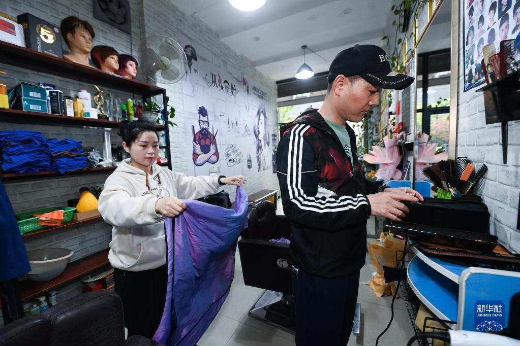 3月30日,在位于杭州市臨平區塘棲鎮的曉珍發(fā)藝工作室內,聾啞人王曉珍(左)和丈夫董華良一起收拾理發(fā)工具,準備去給盲人門(mén)球隊的隊員們義務(wù)理發(fā)。從2021年開(kāi)始,王曉珍夫妻倆定期到位于塘棲鎮的國家盲人門(mén)球基地為運動(dòng)員們義務(wù)理發(fā)。