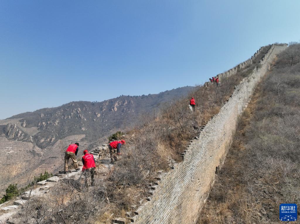 3月29日,“洪山口長(cháng)城保護小分隊”隊員在長(cháng)城上清理垃圾、樹(shù)枝(無(wú)人機照片)。