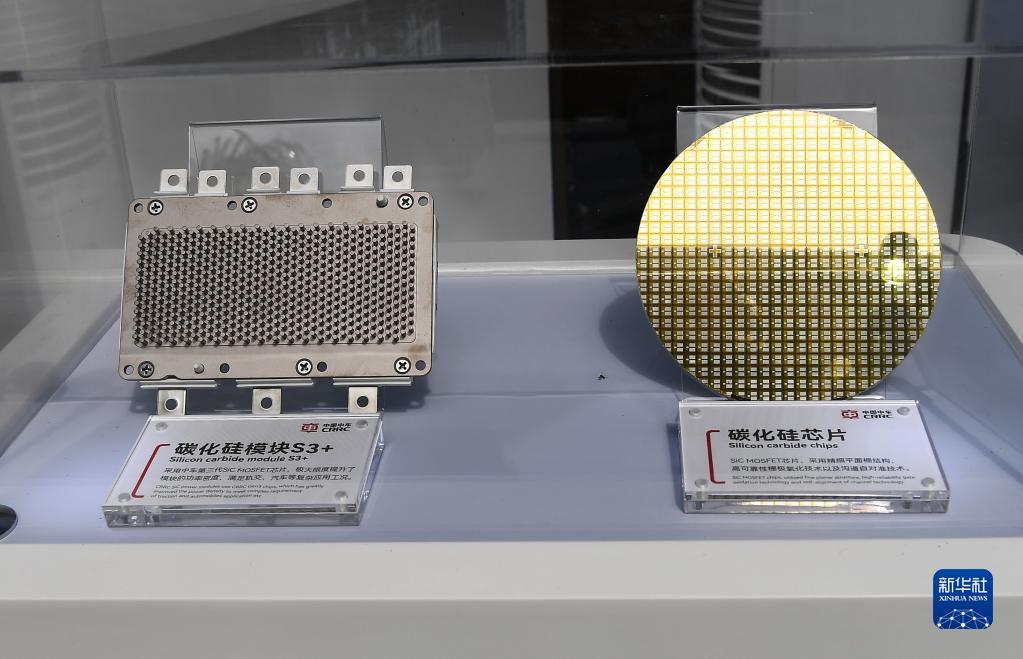 這是3月29日在“新能源 新基建 新產(chǎn)業(yè):綠色動(dòng)能 向新而行”展臺拍攝的碳化硅芯片(右)和碳化硅模塊S3+。