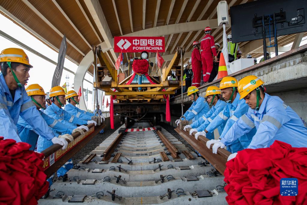 3月31日,在印度尼西亞雅加達雅萬(wàn)高鐵哈利姆車(chē)站,工人鋪設雅萬(wàn)高鐵全線(xiàn)最后一根鋼軌。