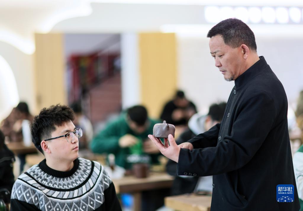 3月30日,授課老師范偉群在江蘇宜興西望紫砂陶瓷專(zhuān)業(yè)合作社指導學(xué)員制作紫砂壺。