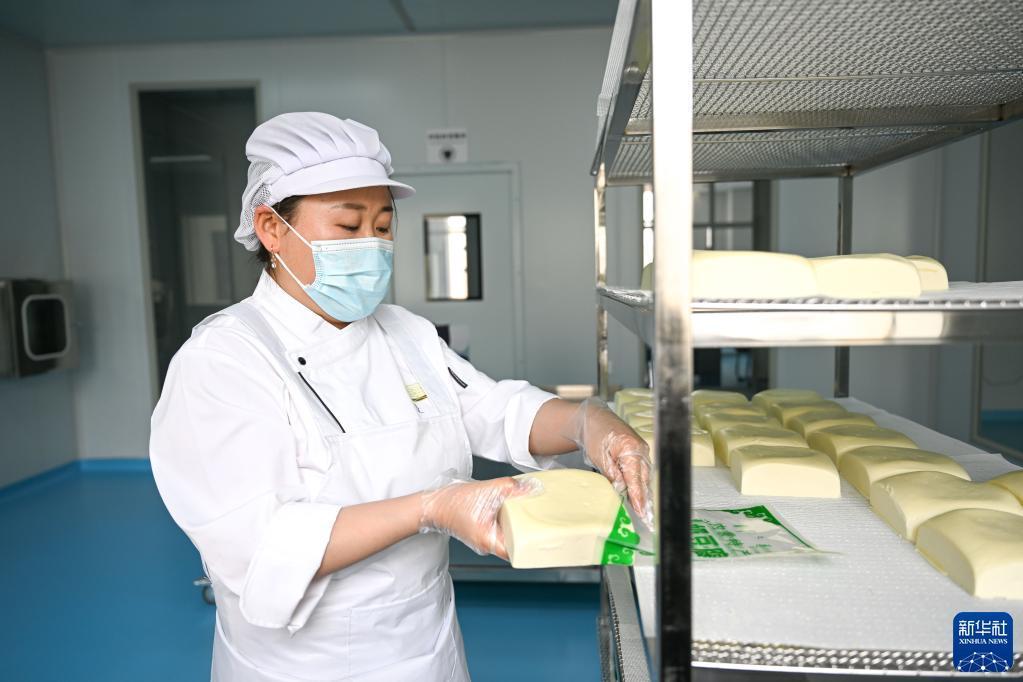 3月31日,在鑲黃旗民族傳統奶制品產(chǎn)業(yè)園的一家奶制品企業(yè)生產(chǎn)車(chē)間,工作人員包裝奶豆腐。