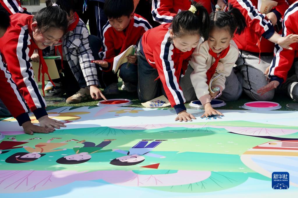 3月31日,徐州市漢橋小學(xué)的學(xué)生在“鐵路安全你我他”宣傳畫(huà)上印上手印。