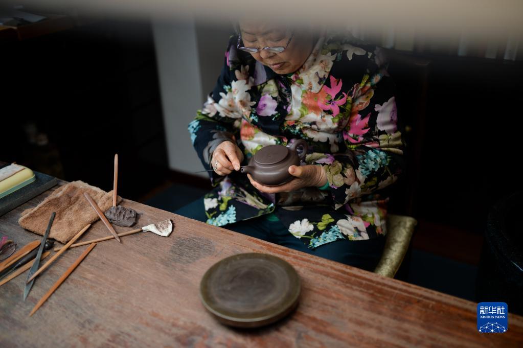 3月30日,曹婉芬在江蘇宜興的工作室制作紫砂壺。