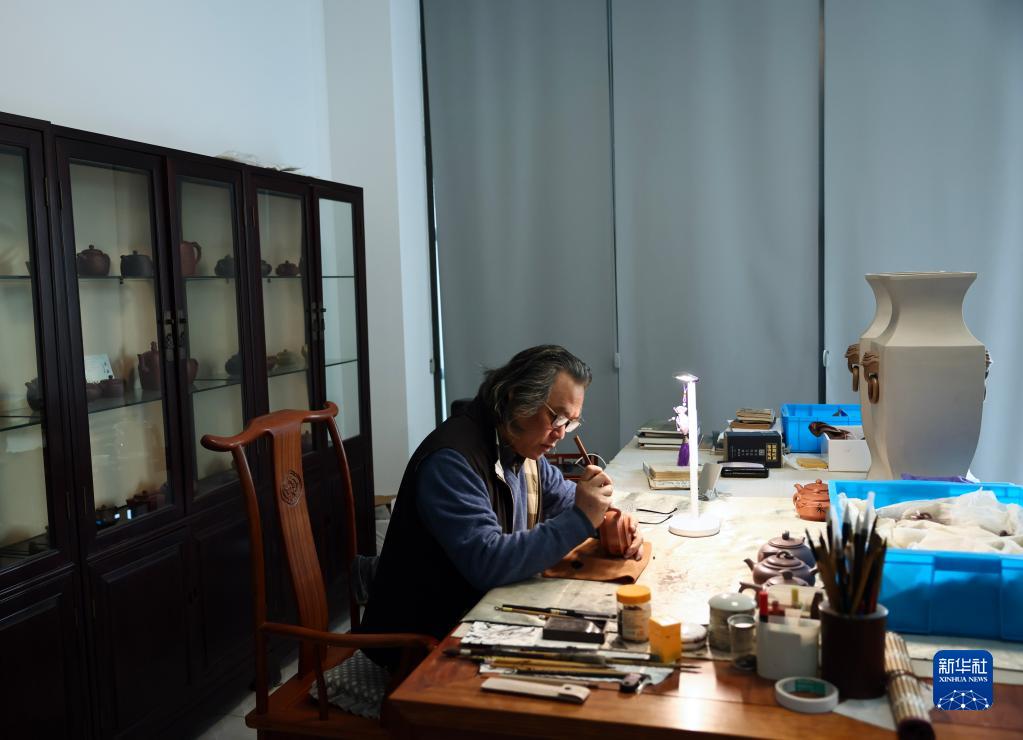 3月30日,曹婉芬的兒子范建軍在江蘇宜興的工作室為紫砂壺刻字。