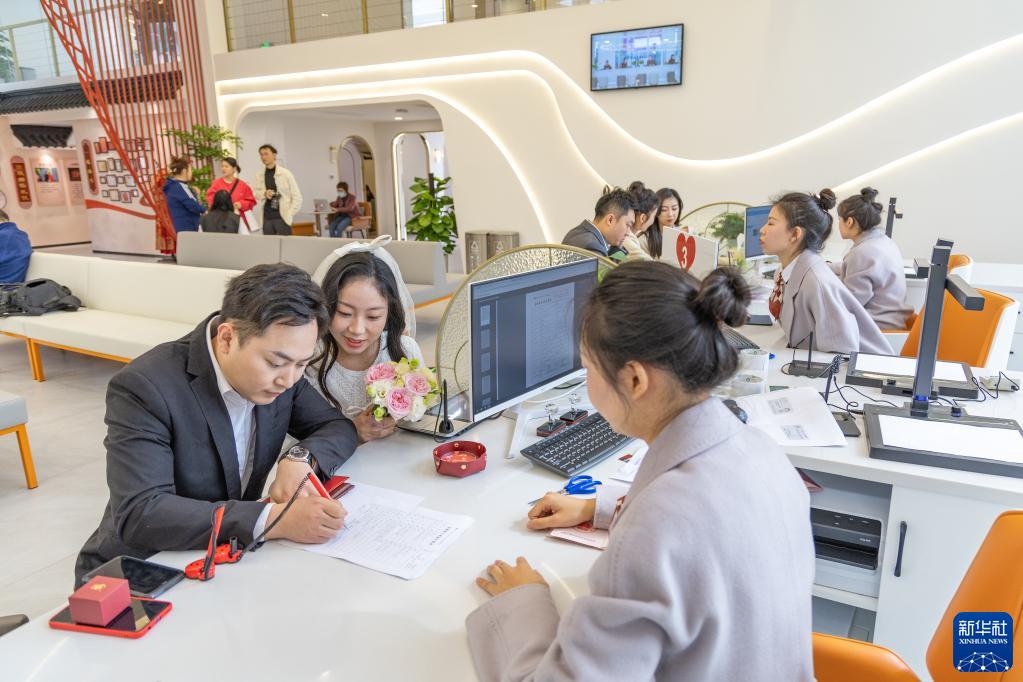 3月31日,人們在重慶市兩江新區婚姻登記處的窗口辦理婚姻登記。