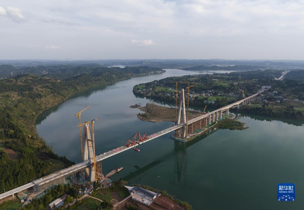俯瞰漢巴南鐵路嘉陵江特大橋(3月30日攝,無(wú)人機照片)。由蜀道集團四川路橋承建、中鐵五院設計漢巴南鐵路嘉陵江特大橋全長(cháng)1770.82米,最高主塔高164.5米,是一座雙線(xiàn)高速鐵路高低塔混合梁斜拉橋。