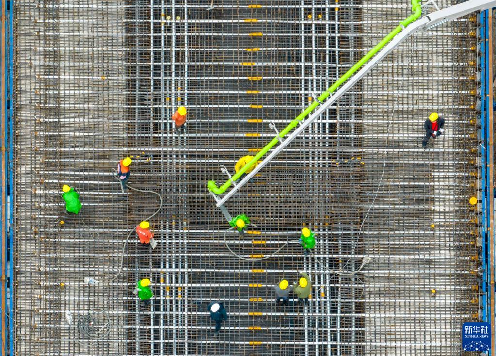 3月30日,中交二航局工人在安徽省馬鞍山巢馬城際鐵路建設現場(chǎng)進(jìn)行首跨公路梁混凝土澆筑作業(yè)(無(wú)人機照片)。