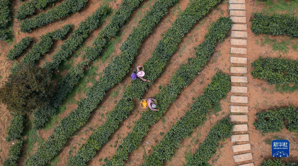 茶農在六盤(pán)水市六枝特區落別布依族彝族鄉鴻森茶園采摘春茶(3月31日攝,無(wú)人機照片)。