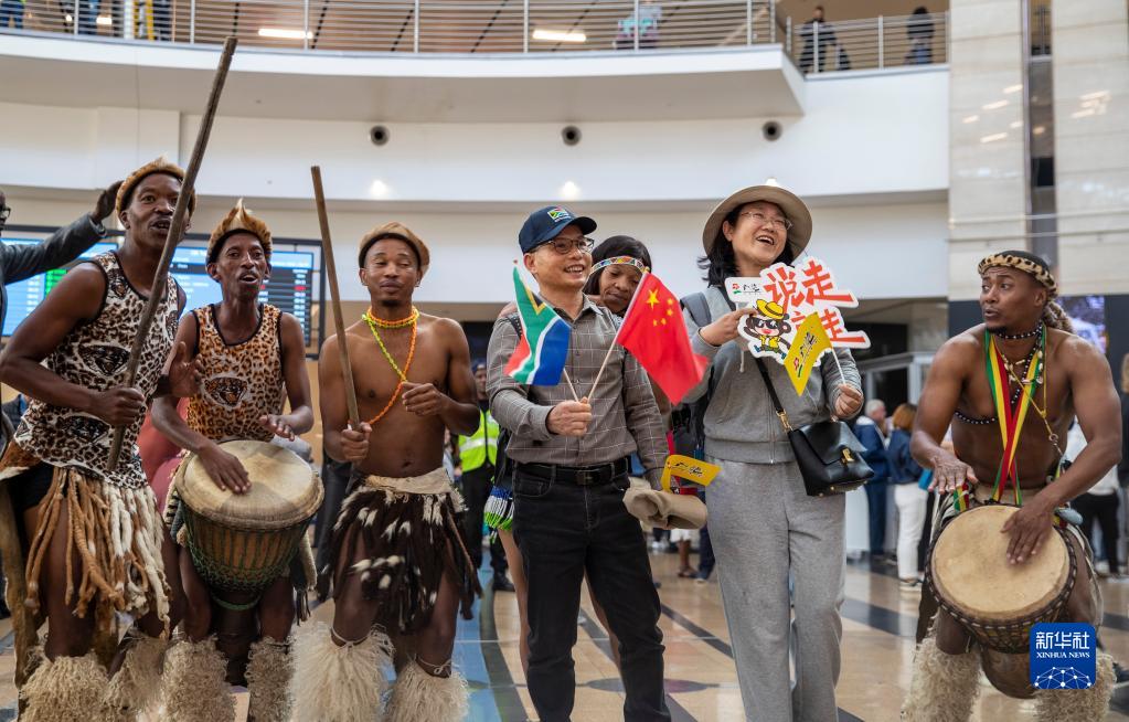 3月29日,在南非約翰內斯堡坦博國際機場(chǎng)舉行的歡迎儀式上,舞蹈演員與中國游客互動(dòng)。