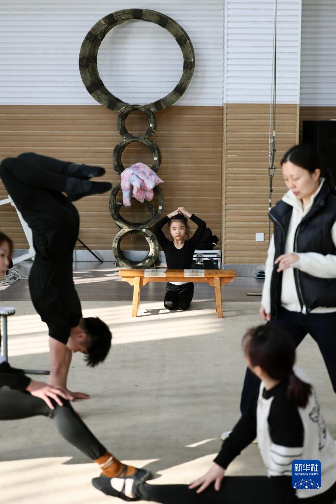 3月31日,在位于江蘇省鹽城市建湖縣的江蘇省雜技團,一名小演員在觀(guān)摩訓練。