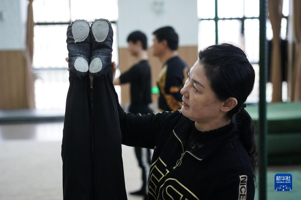 3月31日,在位于江蘇省鹽城市建湖縣的江蘇省雜技團,老師在幫助小演員練習基本功。
