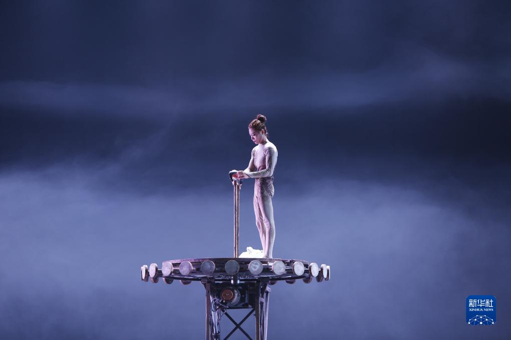 3月31日,在江蘇省鹽城市建湖縣,雜技演員王夢(mèng)塵練習《煉——倒立技巧》。