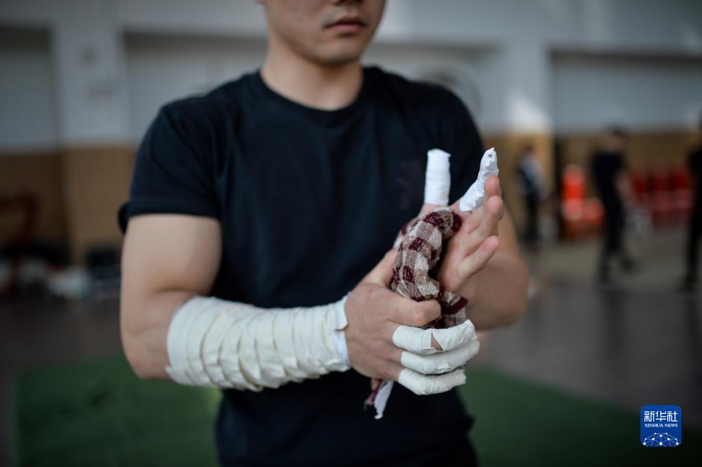 3月31日,在位于江蘇省鹽城市建湖縣的江蘇省雜技團,一名演員的雙手纏滿(mǎn)膠布。