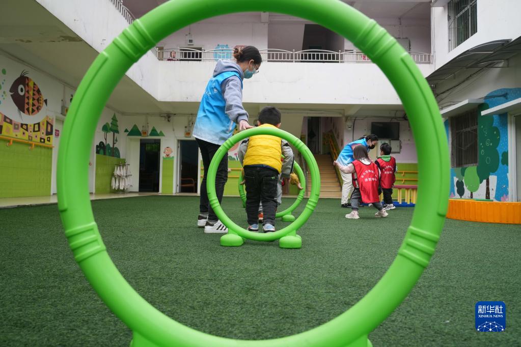 3月31日,在重慶市北碚區奔月鐵路幼兒園康教中心,特教老師幫助孤獨癥兒童進(jìn)行感統訓練。