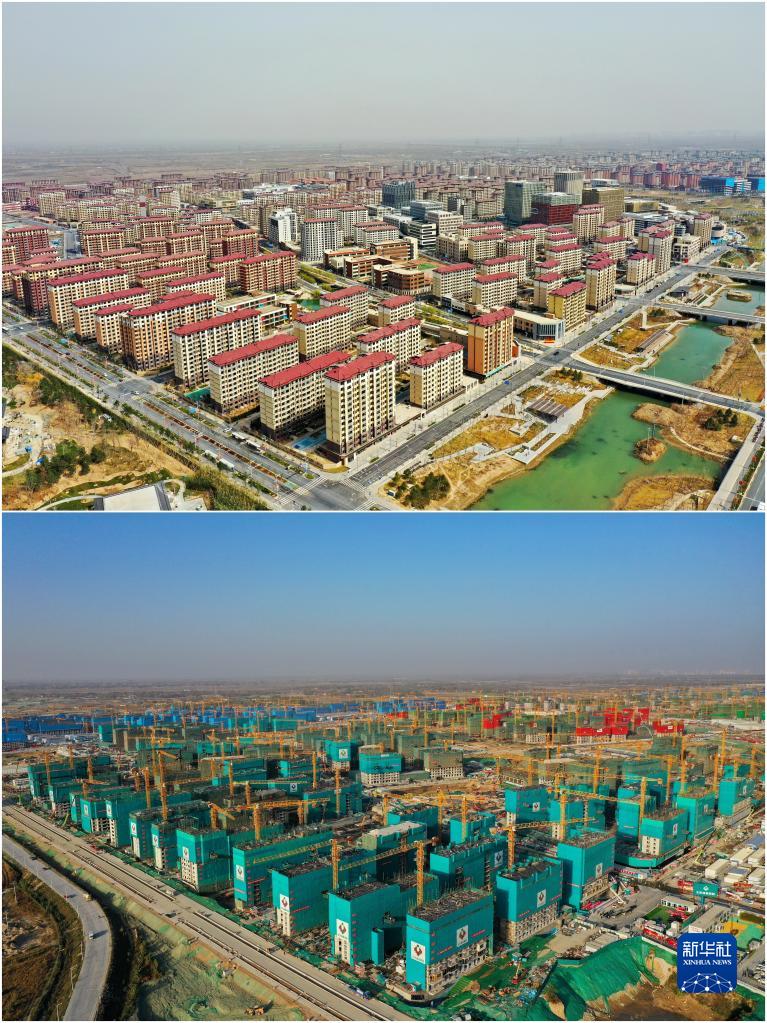 拼版照片:上圖為2023年3月24日拍攝的雄安新區容東片區(無(wú)人機照片);下圖為2020年11月6日拍攝的雄安新區容東片區建設現場(chǎng)(無(wú)人機照片)。