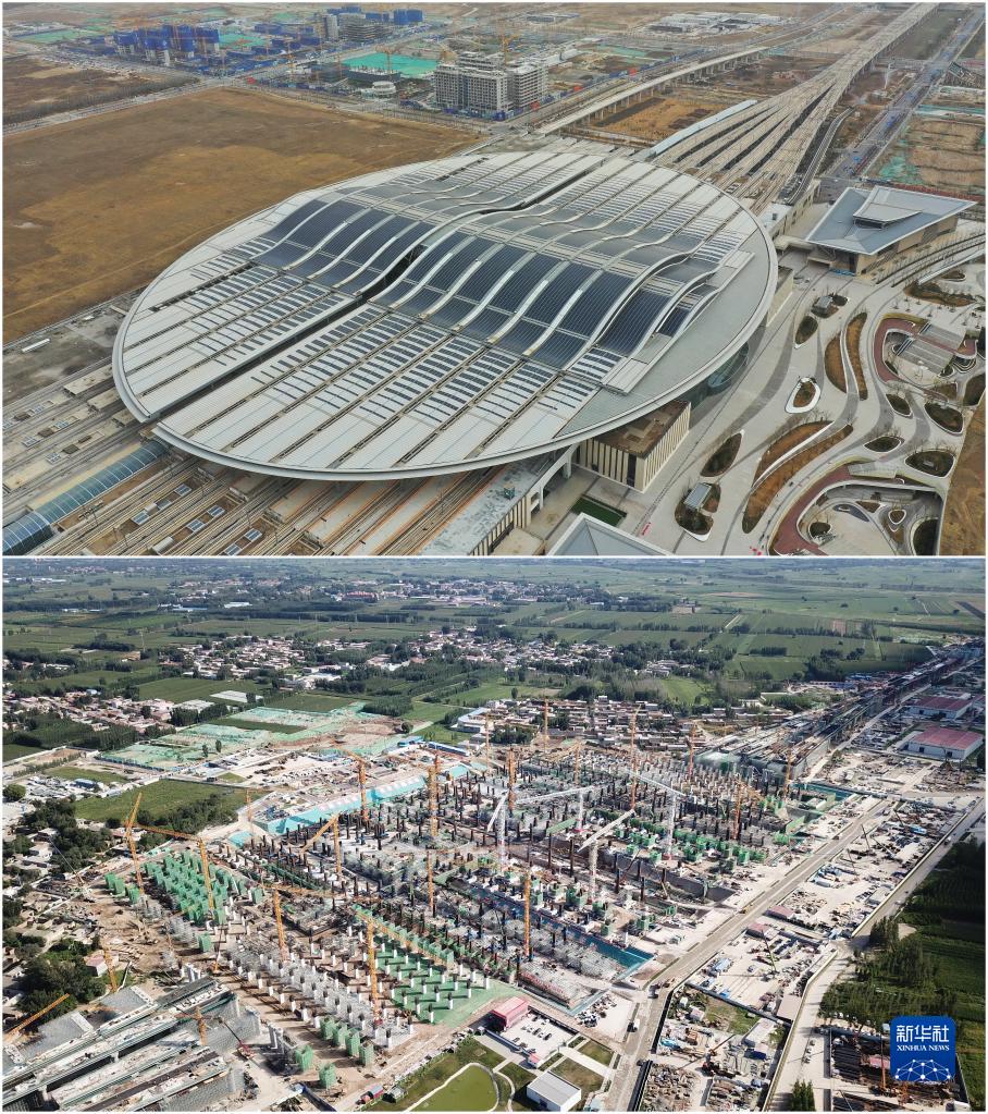 拼版照片:上圖為2023年3月23日拍攝的京雄城際鐵路雄安站(無(wú)人機照片);下圖為2019年8月29日拍攝的京雄城際鐵路雄安站建設現場(chǎng)(無(wú)人機照片)。