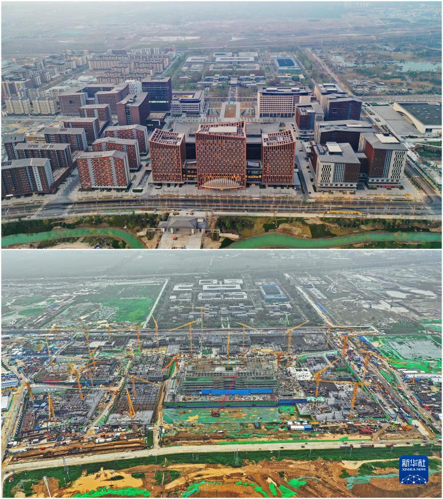 拼版照片:上圖為2023年3月31日拍攝的雄安新區商務(wù)服務(wù)中心(無(wú)人機照片);下圖為2020年8月13日拍攝的雄安新區商務(wù)服務(wù)中心建設現場(chǎng)(無(wú)人機照片)。