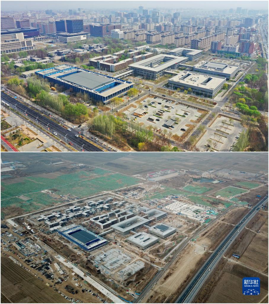 拼版照片:上圖為2023年3月31日拍攝的雄安新區市民服務(wù)中心(無(wú)人機照片);下圖為2018年3月21日拍攝的雄安新區市民服務(wù)中心建設現場(chǎng)(無(wú)人機照片)。
