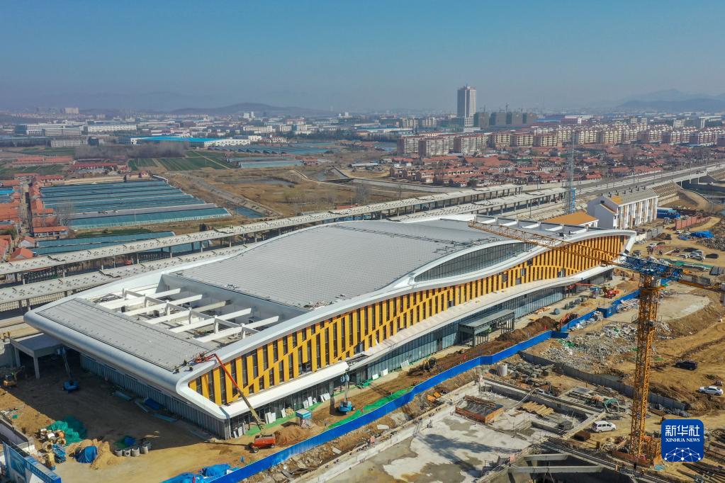 鳥(niǎo)瞰建設中的萊榮鐵路海陽(yáng)站(3月31日攝 ,無(wú)人機照片)。