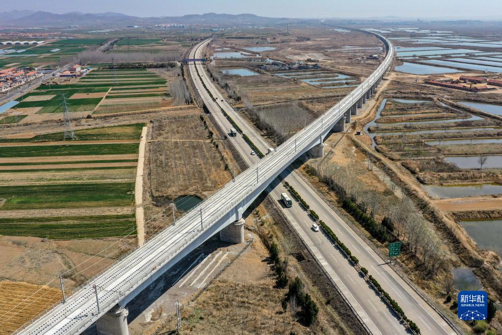 鳥(niǎo)瞰萊榮鐵路跨威青高速特大橋段(3月31日攝,無(wú)人機照片)。