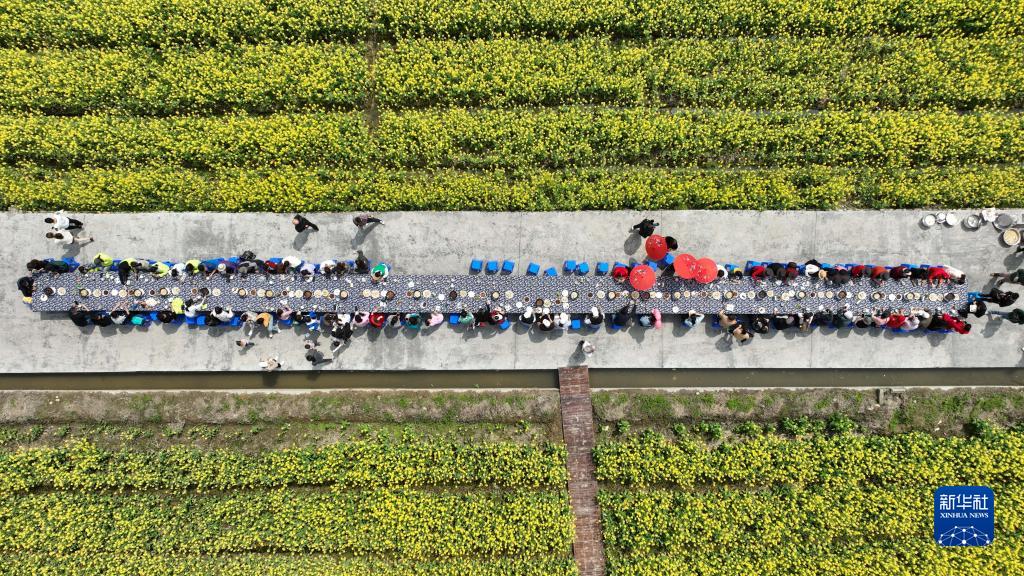 4月1日,游客在油菜花地里品嘗鄉間長(cháng)桌宴(無(wú)人機照片)。