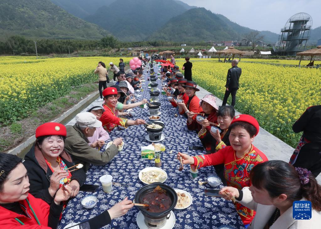 4月1日,游客在油菜花地里品嘗鄉間長(cháng)桌宴。