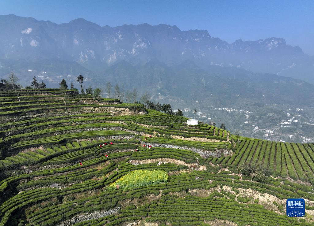 4月1日,茶農在秭歸縣茅坪鎮一茶園采摘“明前茶”(無(wú)人機照片)。