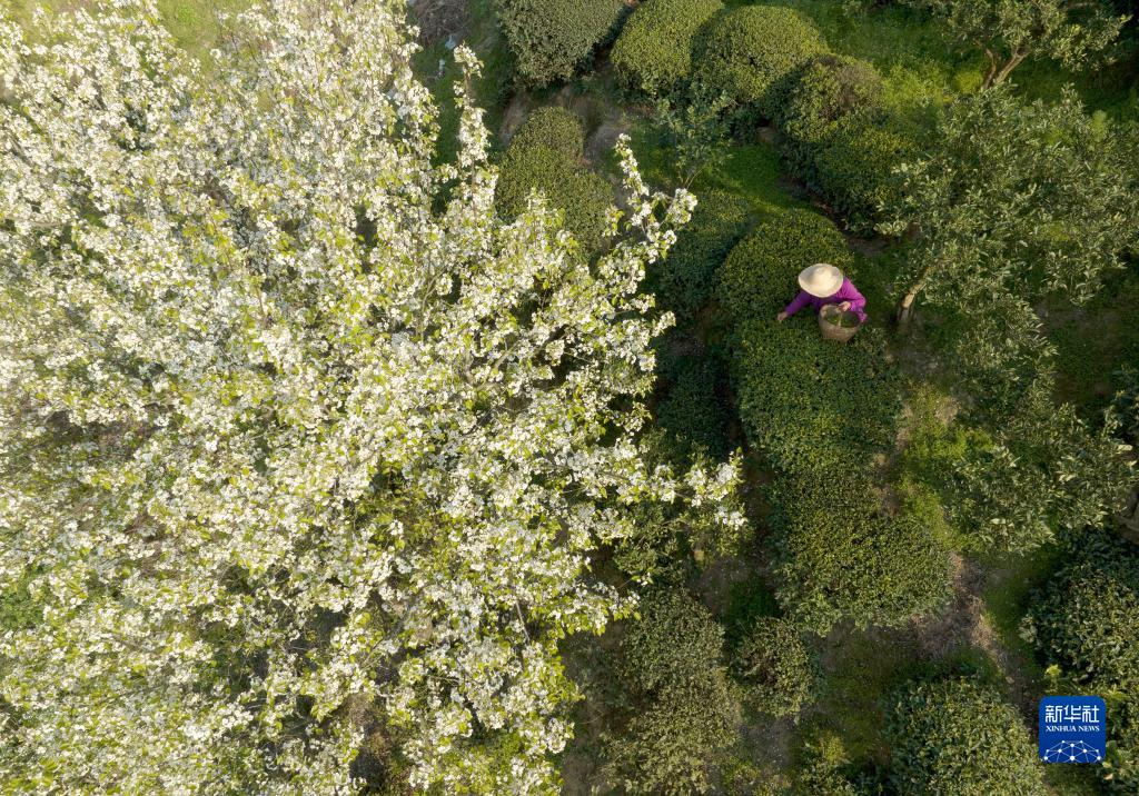 秭歸縣茅坪鎮松樹(shù)坳村茶農在茶園采摘茶葉嫩芽(3月30日攝,無(wú)人機照片)。