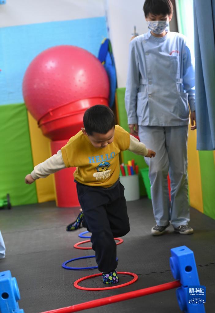 3月30日,在西安市金色陽(yáng)光康復中心,特教老師指導孩子進(jìn)行康復訓練。
