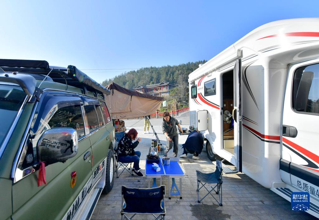 4月1日,在宣恩縣椒園鎮黃坪村,開(kāi)著(zhù)房車(chē)旅行的游客在梨園旁的空地上準備早餐。