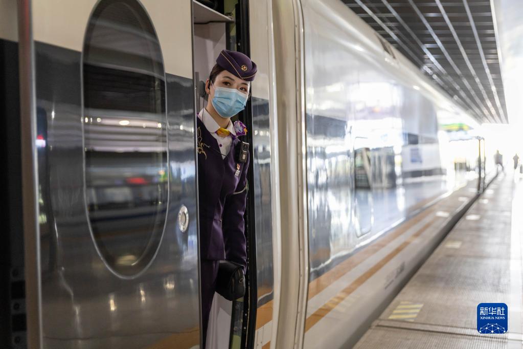 4月1日,G99次列車(chē)長(cháng)李笑家在車(chē)門(mén)口瞭望。