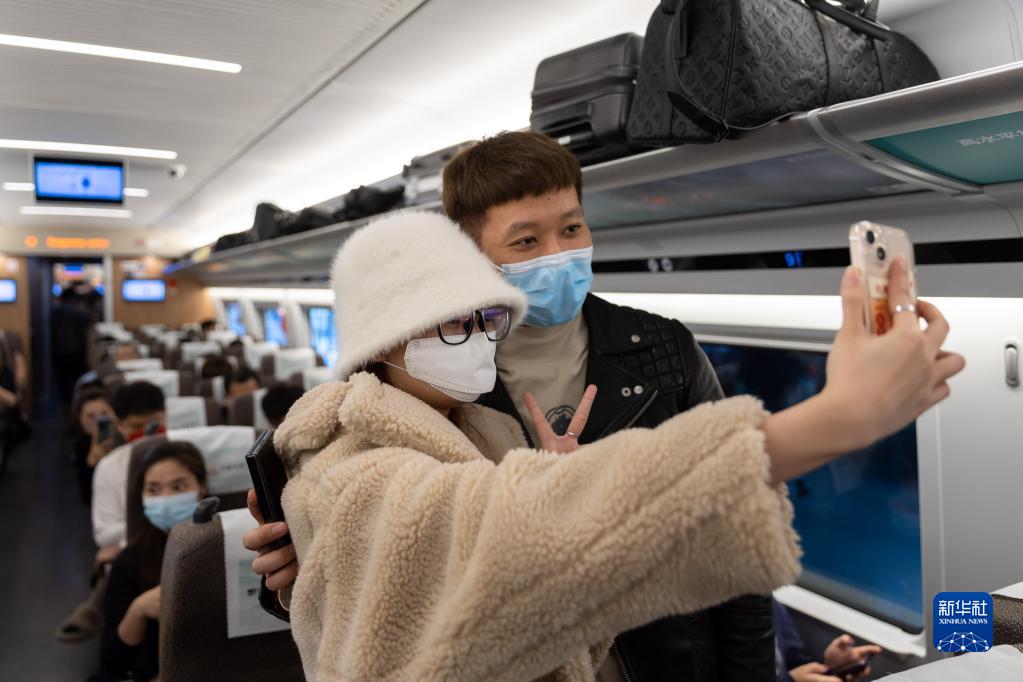 4月1日,旅客在G99次列車(chē)發(fā)車(chē)前自拍留影。