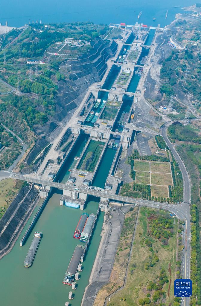 4月1日,船舶有序通過(guò)三峽雙線(xiàn)五級船閘(無(wú)人機照片)。