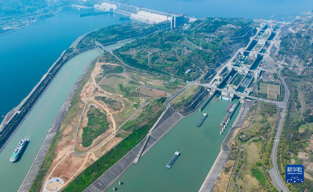 4月1日,船舶有序通過(guò)三峽雙線(xiàn)五級船閘和升船機(無(wú)人機照片)。
