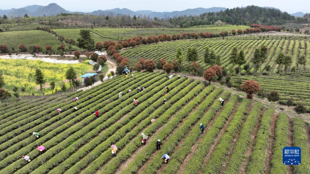 4月1日,村民在岑鞏縣天馬鎮一茶葉種植基地采摘明前茶(無(wú)人機照片)。