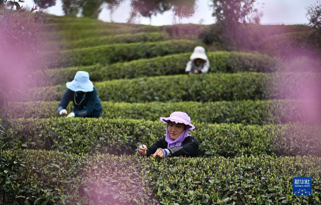 4月1日,村民在岑鞏縣天馬鎮一茶葉種植基地采摘明前茶。