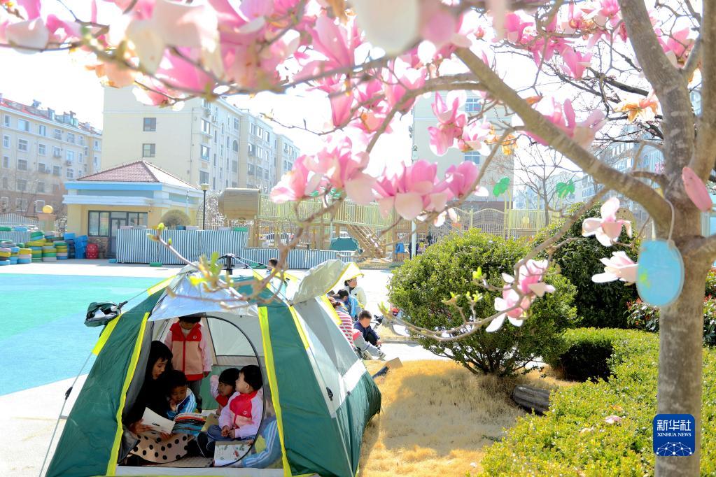 3月30日,在山東省青島市西海岸新區濱海新村幼兒園,家長(cháng)和幼兒在校園里閱讀繪本。