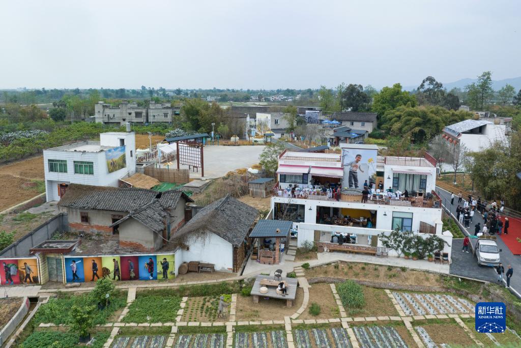 這是在寶勝村村屋墻壁上展出的影像藝術(shù)作品(4月1日攝,無(wú)人機照片)。
