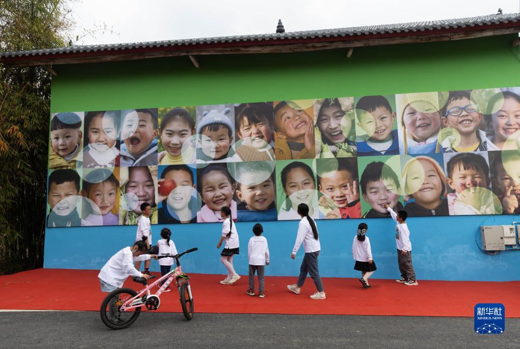 4月1日,寶勝村的孩子們在“笑臉墻”上尋找自己的笑臉。