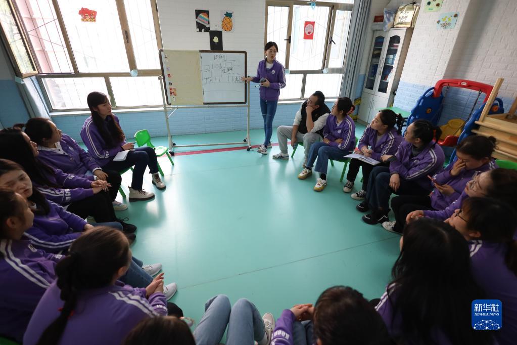 3月31日,特教老師陳進(jìn)(中)與同事交流學(xué)習。