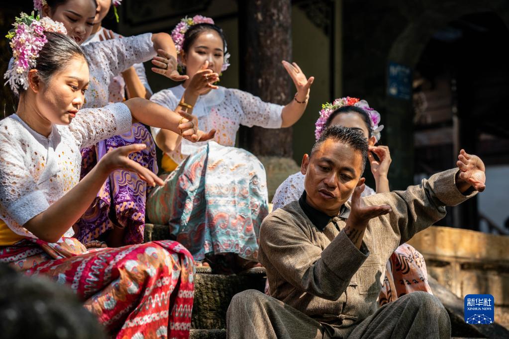 耿馬縣民族歌舞團團長(cháng)王峰(右下)在和演員們交流舞蹈動(dòng)作(3月23日攝)。