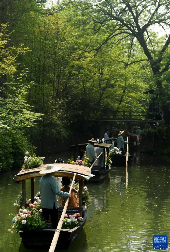 4月2日,游船行進(jìn)在西溪濕地水道上。