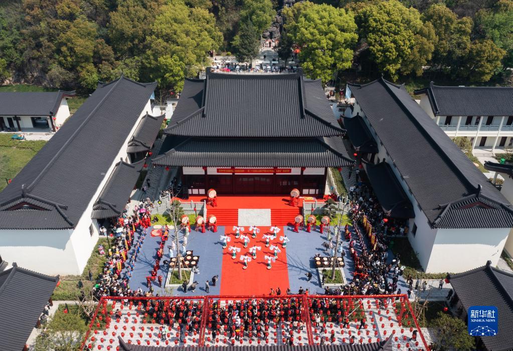 4月2日拍攝的含山蠶花節“祭蠶神”民俗表演(無(wú)人機照片)。