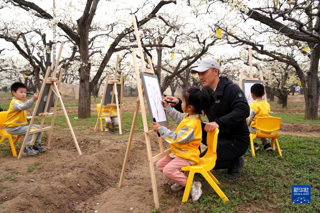 4月2日,老師指導小朋友在臨城縣北程村百年梨園寫(xiě)生。