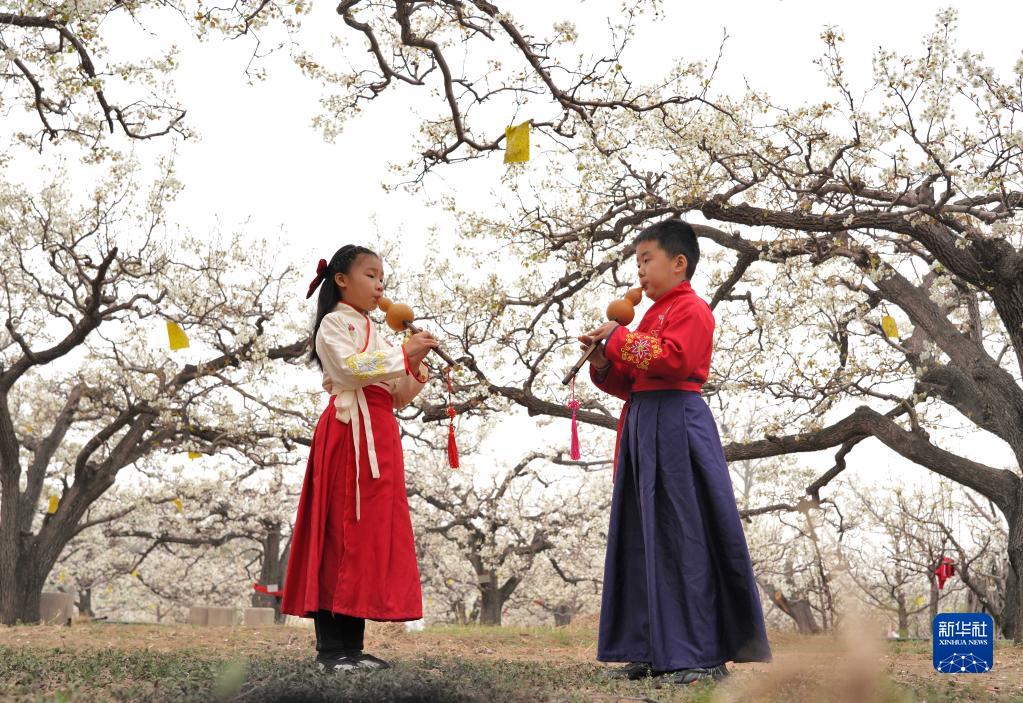 4月2日,在臨城縣北程村百年梨園舉行的梨花節主題活動(dòng)上,小朋友吹奏葫蘆絲。