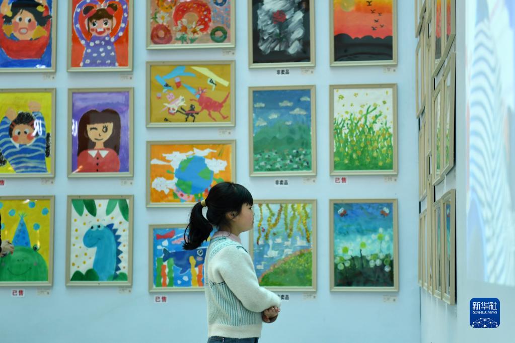4月2日,小朋友在世界孤獨癥日主題慈善活動(dòng)現場(chǎng)觀(guān)看藝術(shù)畫(huà)作。